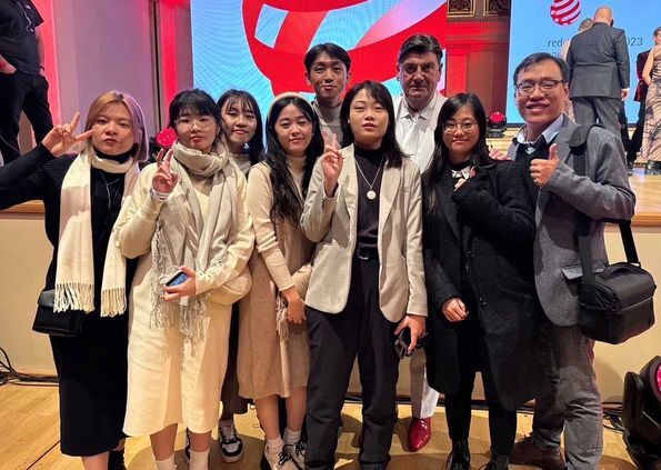 此次由視傳系陳維翰老師與八位師生共同組團親自前往德國柏林參加頒獎典禮,並與紅點主席Prof. Dr. Peter Zec彼得•澤克博士合影留念,