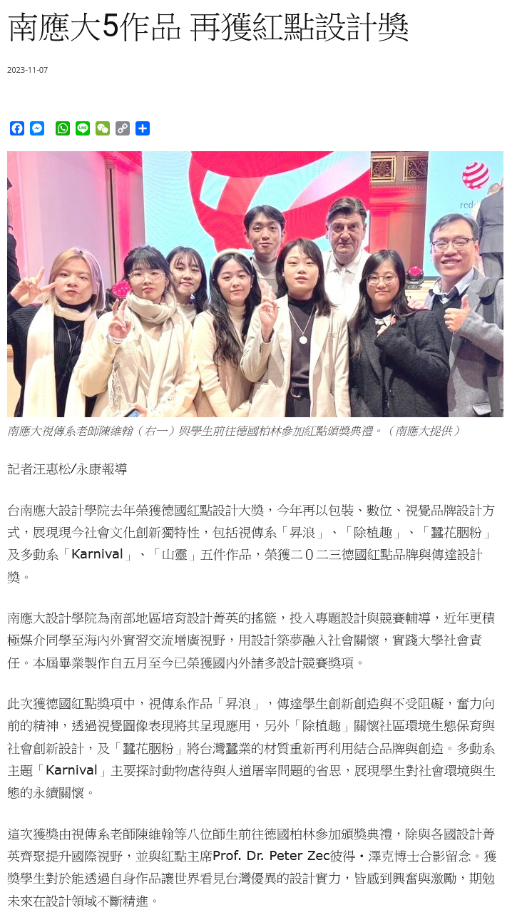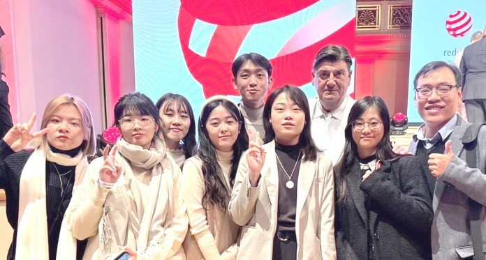 這次獲獎由視傳系老師陳維翰等八位師生前往德國柏林參加頒獎典禮,除與各國設計菁英齊聚提升國際視野,並與紅點主席Prof. Dr. Peter Zec彼得•澤克博士合影留念。獲獎學生對於能透過自身作品讓世界看見台灣優異的設計實力,皆感到興奮與激勵,期勉未來在設計領域不斷精進。