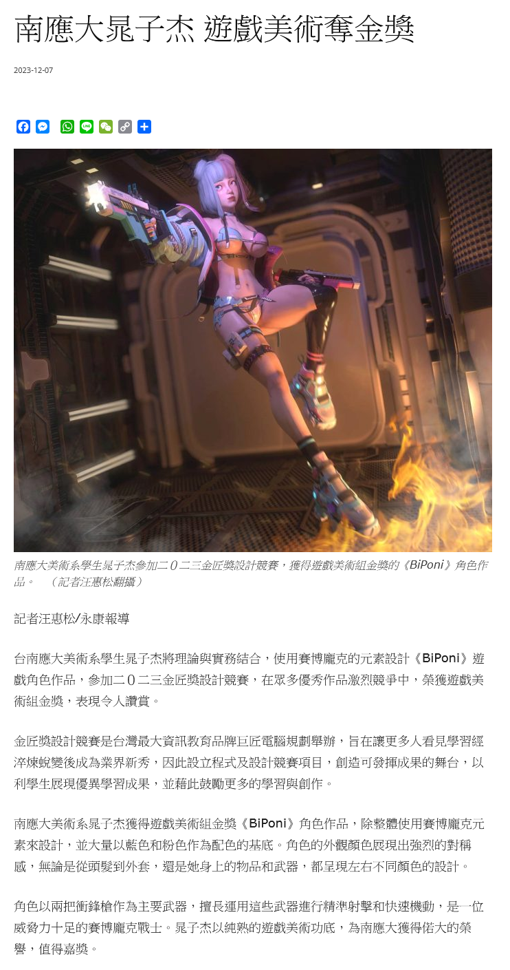 台南應大美術系學生晁子杰將理論與實務結合,使用賽博龐克的元素設計《BiPoni》遊戲角色作品,參加二0二三金匠獎設計競賽,在眾多優秀作品激烈競爭中,榮獲遊戲美術組金獎,表現令人讚賞。